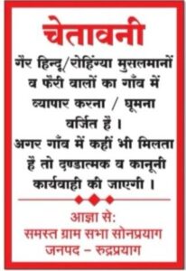 सोनप्रयाग में एक सार्वजनिक बोर्ड लगाया गया है जिसमें क्षेत्र में व्यापार के लिए गैर-हिंदुओं/रोहिंग्या मुसलमानों के प्रवेश पर प्रतिबंध की घोषणा की गई है।
